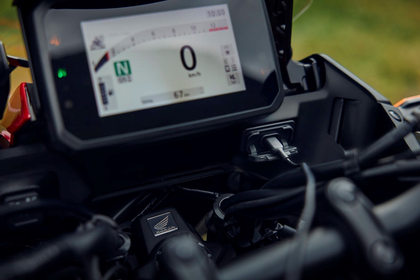 De 310 mm zwevende remschijven en radiaal gemonteerde vierzuiger Nissins in het voorwiel zijn identiek aan die van de CB1000 Hornet, op de GT worden ze wel geholpen door een bochten-ABS dat zijn info krijgt van een IMU. Die IMU werkt eveneens samen met het ride-by-wire, gekoppeld aan de rijmodi. In elk van deze rijmodi staan de vermogensafgifte, de motorrem en de tractiecontrole anders ingesteld, in de User-rijmodus zet je alles zoals je het zelf wil. Het 5” TFT-dashboard met Honda RoadSync kennen we van de Hornet, net als de bedieningsknop op de linker stuurhelft. Turn-by-turn navigatie is mogelijk, rechts onder het dashboard zit een UBS-C aansluiting. In de benzinetank gaat 21 liter brandstof, rijklaar weegt de Honda CB1000GT 229 kilo.