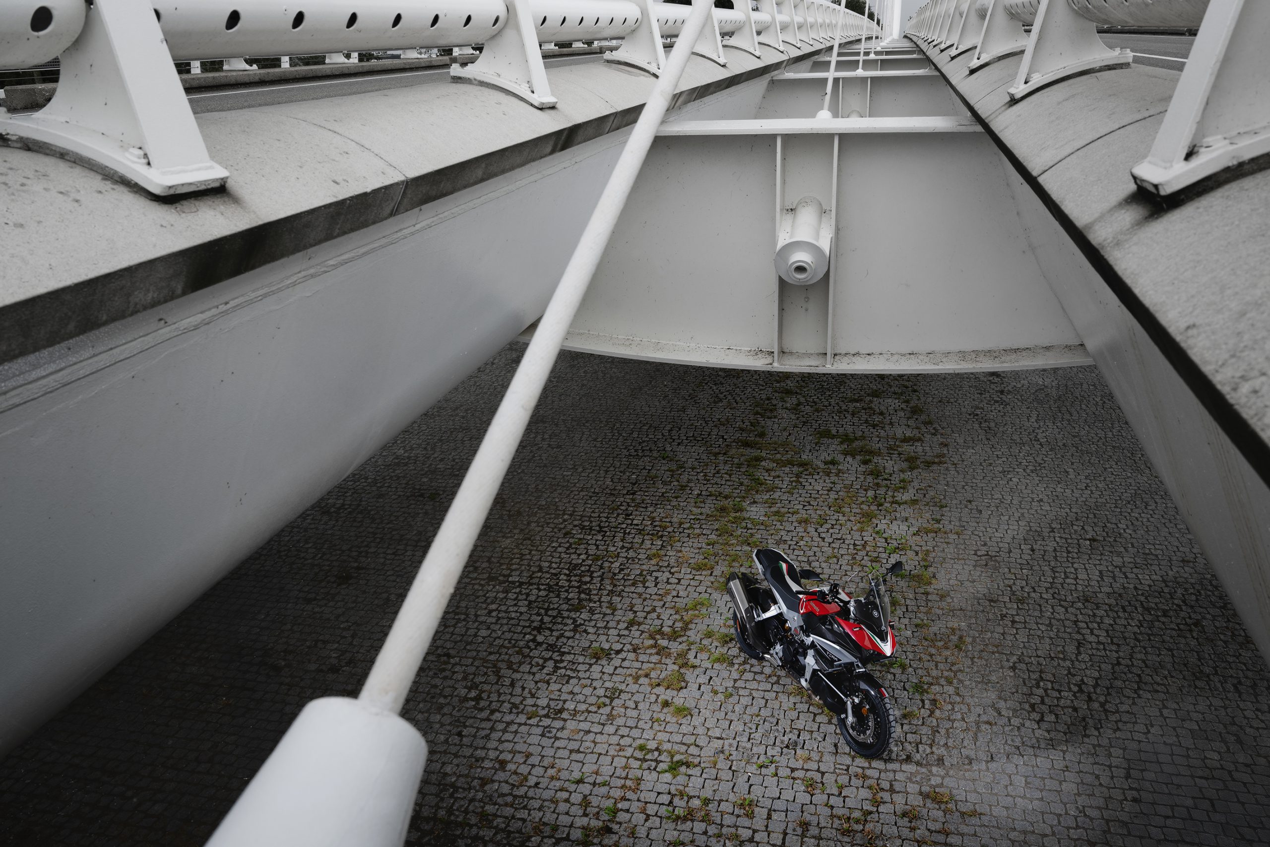 Vanaf het moment dat ik de potige Italiaan de werkplaats uit rol bij de Kawasaki-importeur (blijft een gek idee…) raak ik niet uitgekeken. Alles wat we de afgelopen decennia zijn gaan beschouwen als de geijkte basisingrediënten (voorvork, frame, swingarm) oogt op de Tera opeens heel anders.