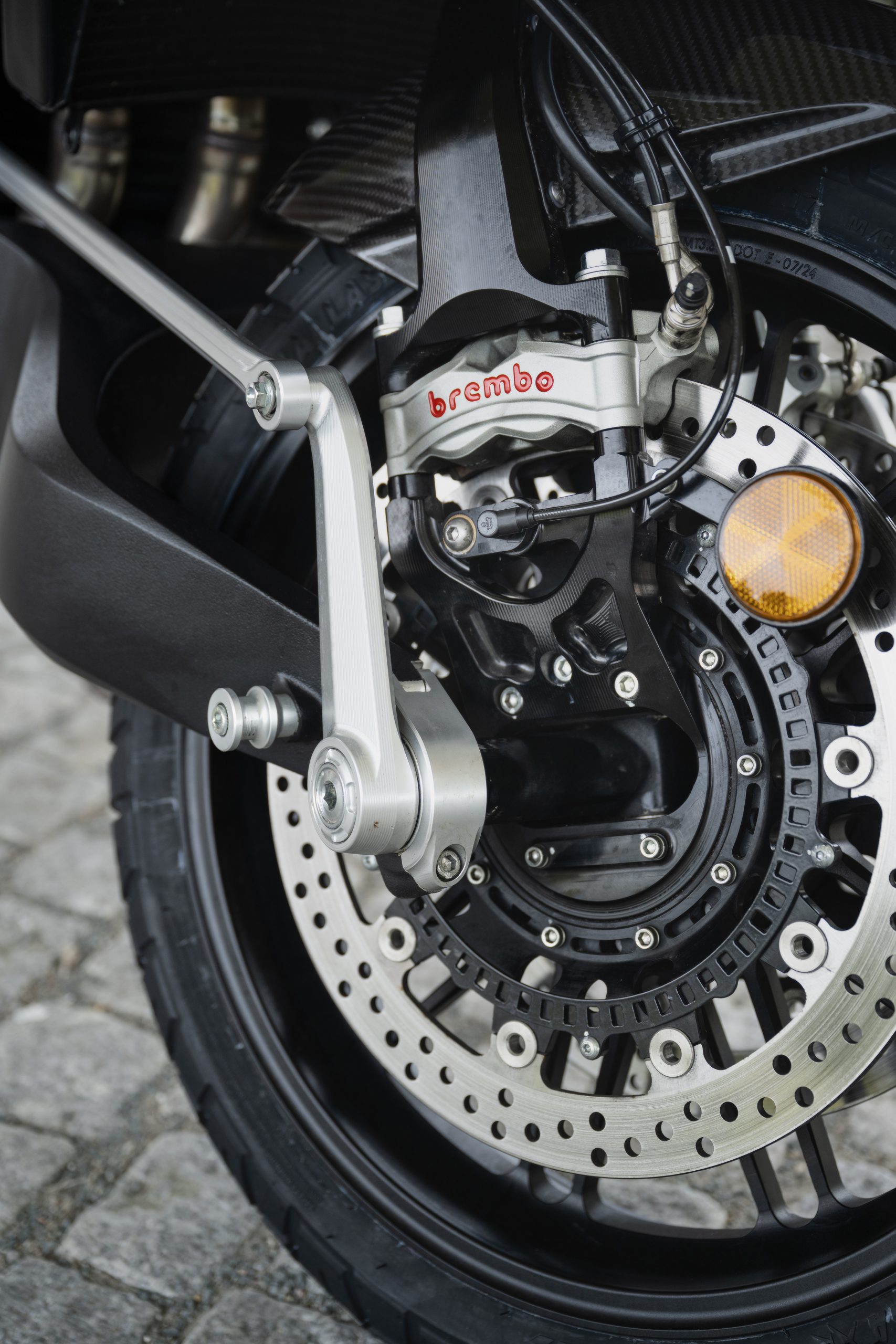 Voorrem: 2 x 330 mm schijven met radiaal gemonteerde Brembo Stylema vierzuigerremklauwen, bochten-ABS