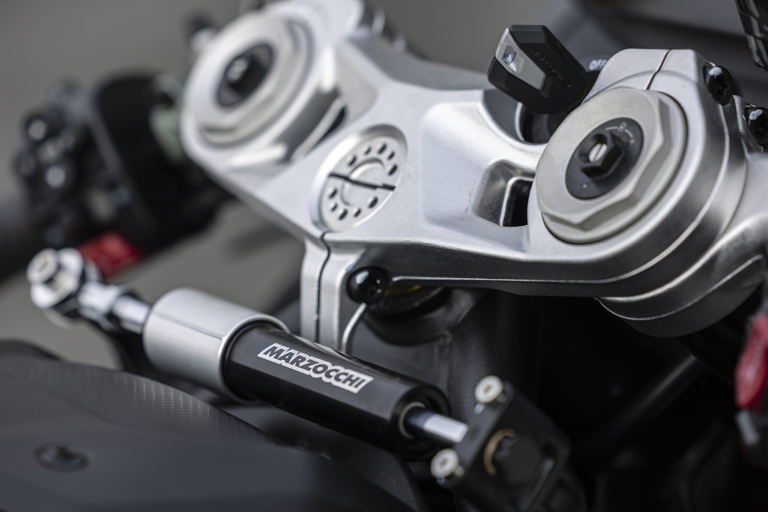 Sterker nog, ook qua gebruikte materialen wappert de Tricolore fier in top. Loop een rondje rondom de 921 RR en je weet genoeg. Marzocchi vering voor en achter, Brembo M50 monoblocs in het voorwiel, Brembo radiale rempomp, Pirelli Rosso IV rubber om de fraaie wielen … de productie mag dan in China hebben plaatsgevonden, Italiaans is de voertaal. Tot aan het kleine Italiaanse vlaggetje op de tank toe, achter het 912 RR-logo. Connaisseurs zullen inmiddels de enkelvoudige swingarm, het achterwiel, de zo kenmerkende gestapelde uitlaatjes (MV’s handelsmerk) en zelfs de carterdelen wel bekend voorkomen.