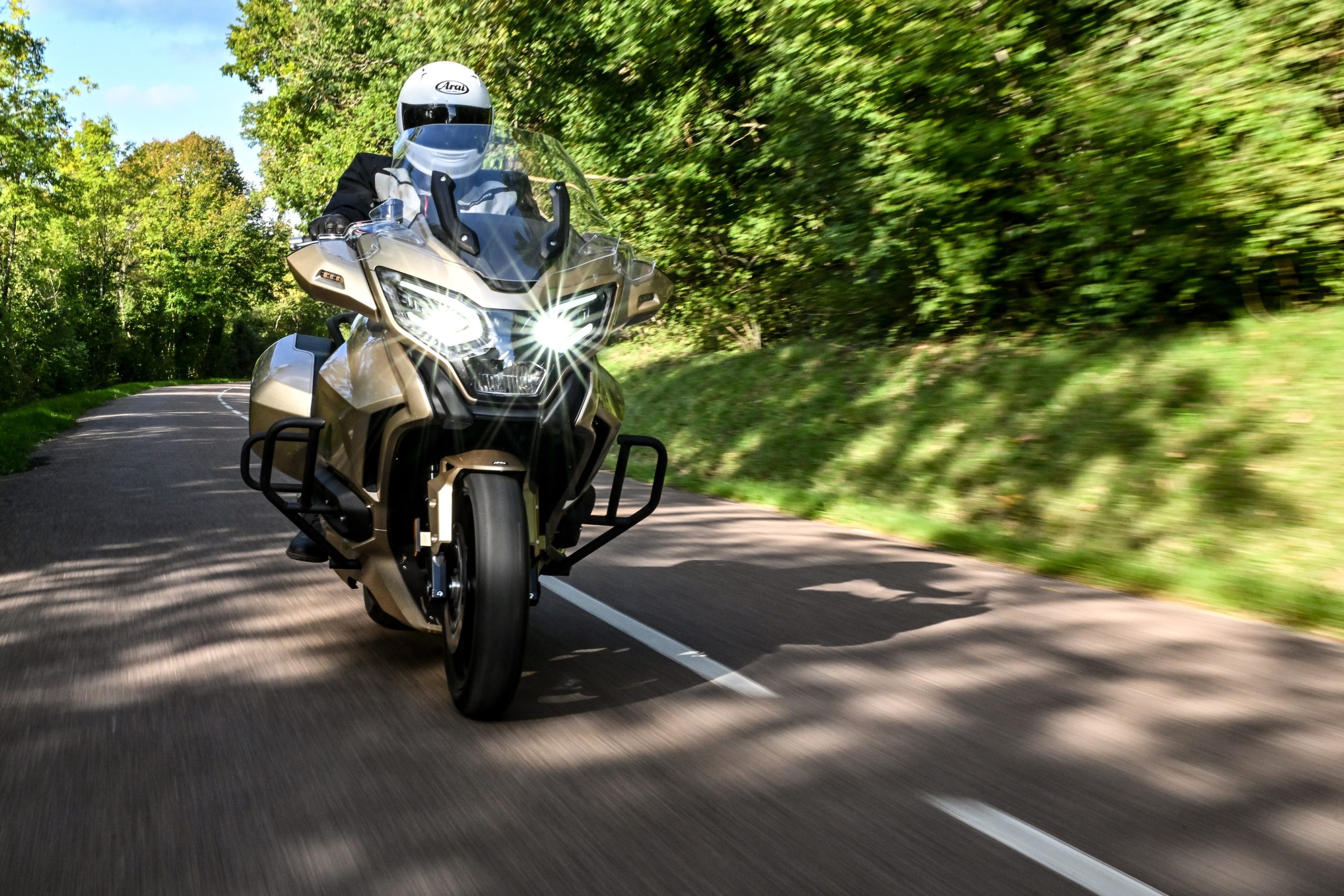 Die vergelijking is moeilijk los te laten, zeker als je kijkt naar het motorblok. In het kuipwerk van de zwarte en gouden GT750 lijkt ruimte gemaakt te zijn voor de cilinderkoppen van een boxermotor, maar niets is minder waar. Onder dat kuipwerk gaat namelijk een vloeistofgekoelde 730cc paralleltwin schuil. Deze produceert 75 pk bij 8.500 tpm en 69 Nm bij 6.900 tpm. De GT750 is er ook als A2-variant, goed voor 47,5 pk. Het motorblok hangt in een aluminium dubbel wiegframe en weegt in totaal, in rijklare staat, 275 kg. Het geclaimde verbruik van 1 liter op 21,7 km zou in combinatie met de 24-literbrandstoftank op een bereik van rond de 500 km uitkomen.