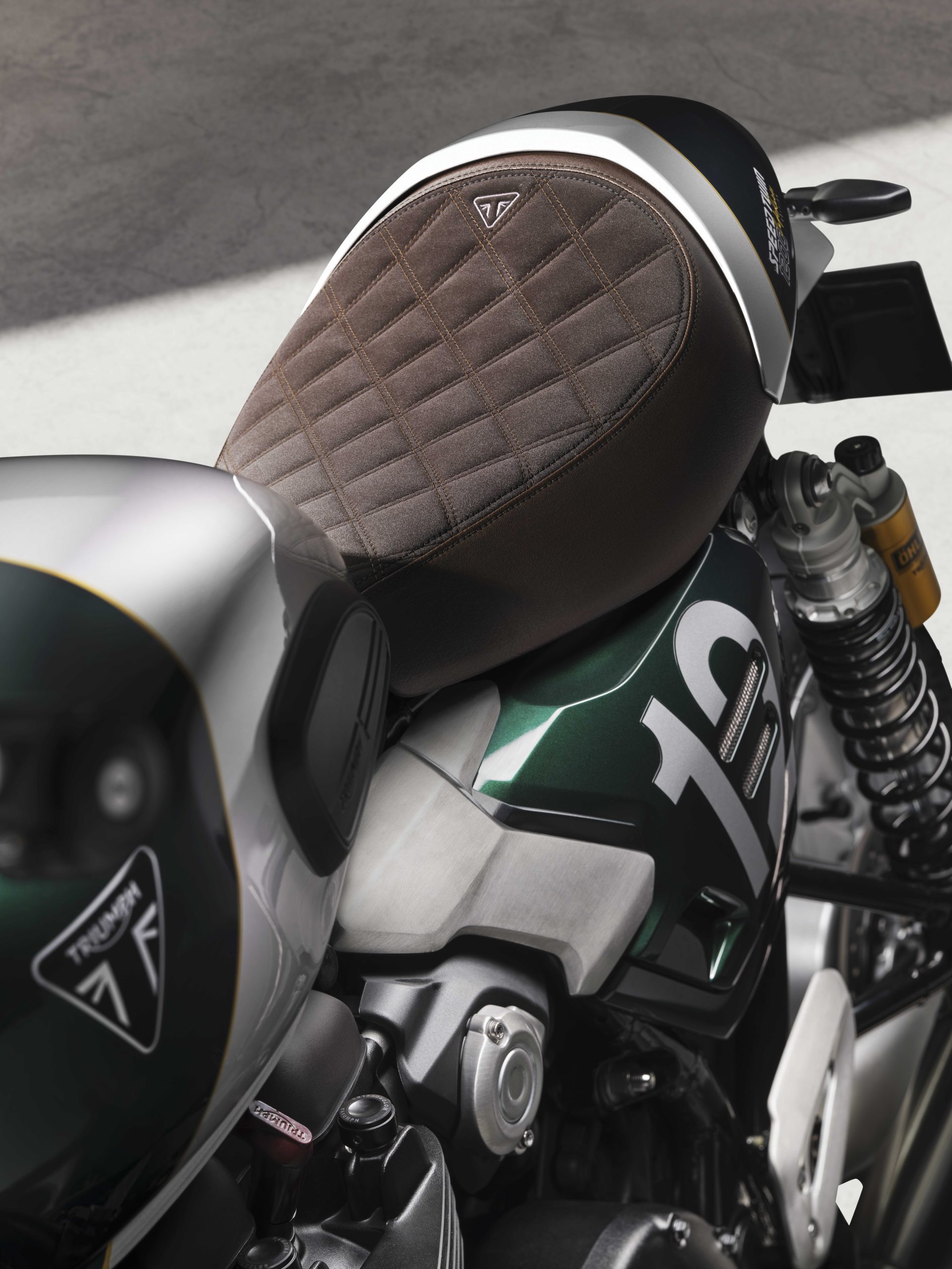 Die RS werd uitgerust met clip-ons, een mooi gestikt eenpersoonszadel, wat coole details rondom (nummerschildjes langszij enz.) en bar-end spiegels. Lijkt hij daardoor niet heel erg op een ietwat kale Thruxton? Ja. Is dat erg? Nee!